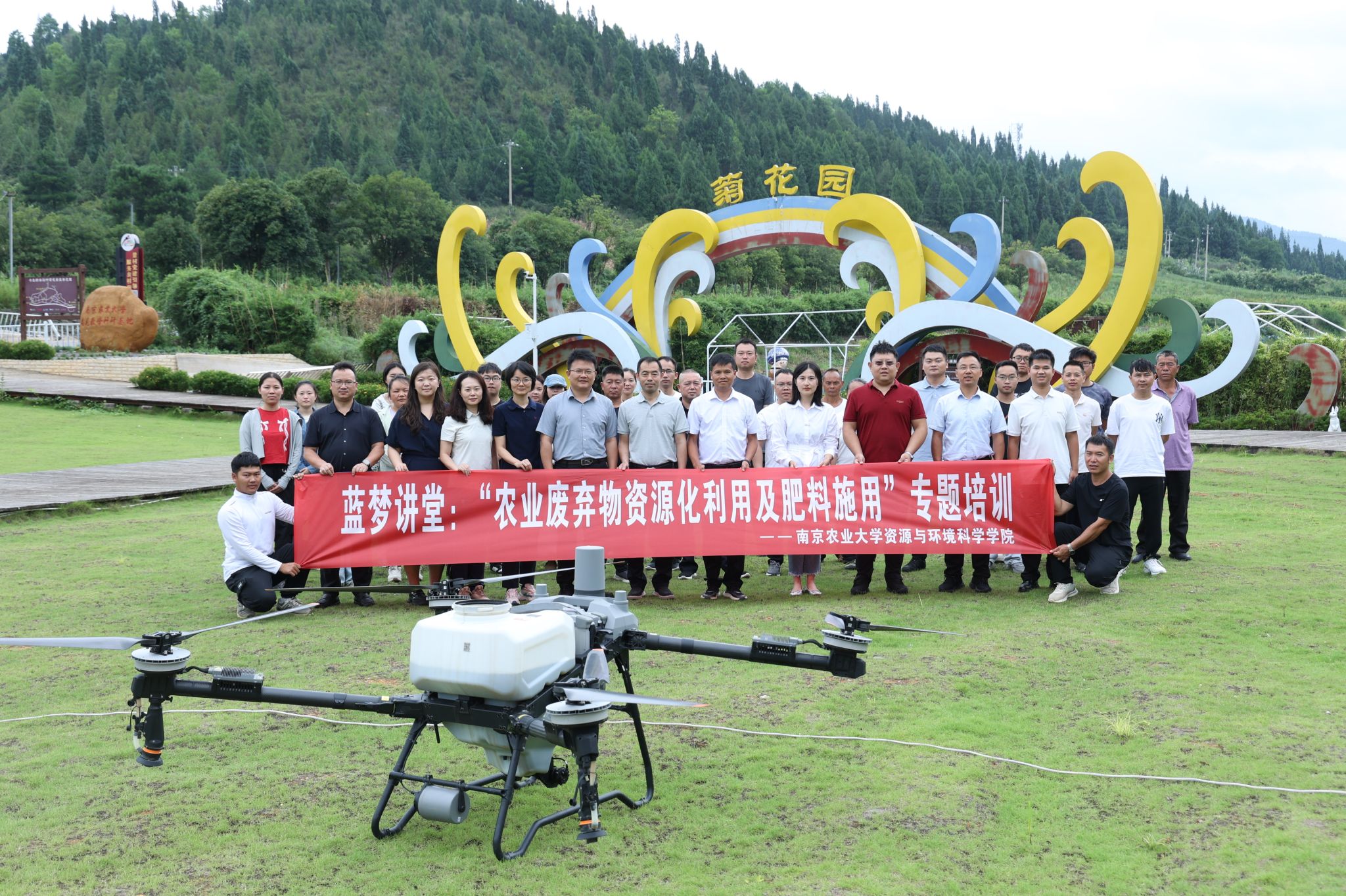 在药谷江村菊花园,郑聚锋、孙明明、杨天杰分别就农业废弃物处理与炭基农业、土壤健康与生物多样性保护、农业废弃物资源化利用与肥料施用三个主题,以“授课+实操”方式,为当地花卉种植管理技术人员、种植户传授开展“蓝梦讲堂”专题培训,并在现场进行无人机有机肥喷洒。