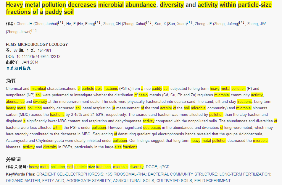 下一篇:Heavy metal pollution decreases microbial abundance, diversity and activity within particle-size fractions of a paddy soil