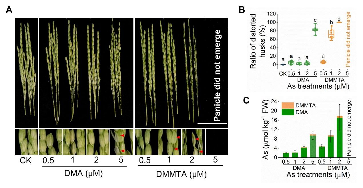 图2. DMMTA诱发水稻直穗病。(A)水稻幼穗表型;(B)水稻直穗病发病率;(C)颖壳砷形态